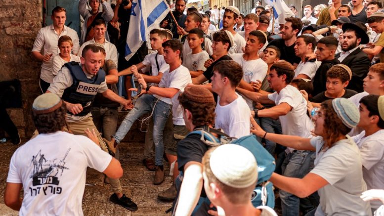 Si tratta di un tripudio di retorica trionfalistica e di bellicosità in cui i giovani del Paese, pressoché tutti coloni, sfilano attraverso l’antico cuore arabo della città. Mentre si aprono la strada giù per gli stretti vicoli, scandendo entusiasti slogan come “morte agli arabi” o “possano i loro villaggi bruciare”, essi minacciano, insultano e sputano contro ogni palestinese sfortunato o abbastanza temerario da trovarsi lungo il loro percorso, e a volte li gettano a terra per colpirli e picchiarli a piacimento. Ogni tanto persino a giornalisti o fotografi ebrei tocca la stessa sorte.