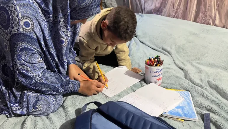 Nuseirat, Striscia di Gaza – Nibal Abu Armana è seduta nella sua tenda, dove insegna a Mohammed, il figlio di sette anni, nozioni di base di alfabetizzazione e matematica.
